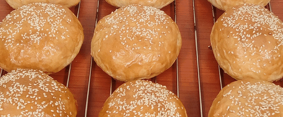 Flatten balls a bit and arrange in buttered or lined baking trays, seam side down spacing about 3 inches apart. Cover loosely with plastic wrap and allow to double in size, about 1 hour.