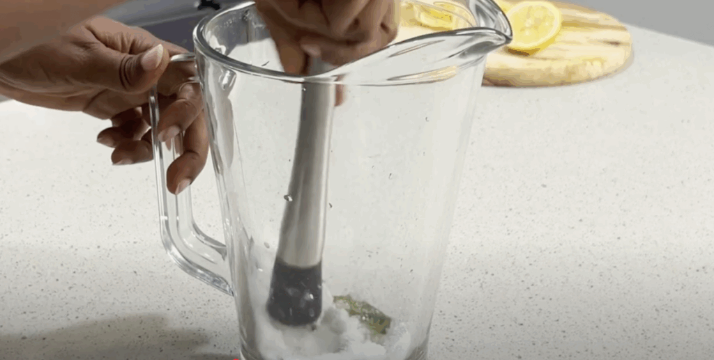 - Gently mash the mint with the sugar to release its fragrance, then add lemon juice and mix thoroughly to combine