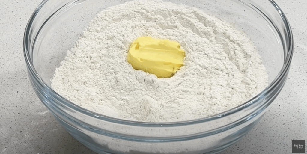 - Add the butter. Using the tips of your fingers, rub the butter into the flour mixture until the consistency resembles large breadcrumbs