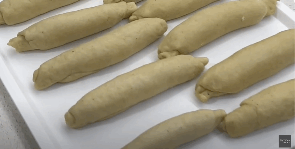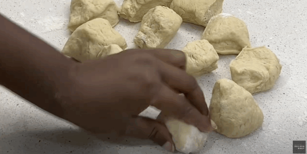 - Remove the dough from the bowl, and transfer it unto a floured work surface. knead for approximately 1 minute, then portion the dough into 10 to 12 pieces